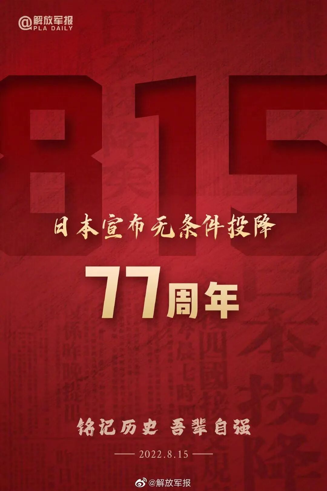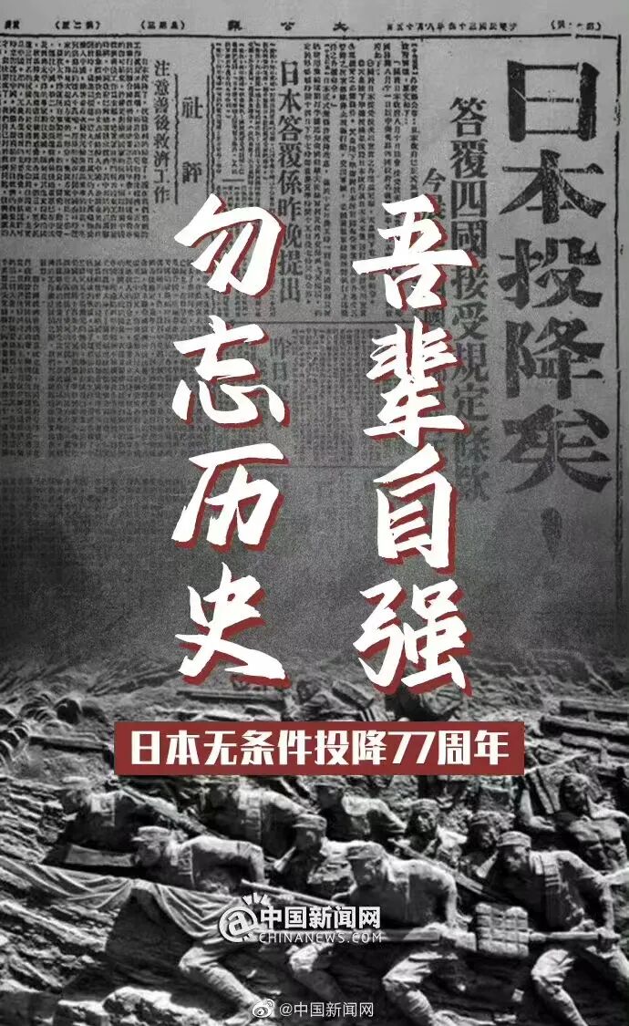 胜利属于伟大的中国人民 1945年8月15日, 是中国人民永远铭记的日子。 这一天, 日本宣布接受《波茨坦公告》, 以广播《停战诏书》的形式, 宣布无条件投降! 日本投降矣! 《大公报》用醒目的大字标题“日本投降矣!”报道了日本投降的消息。 “日本投降矣!”中国军民的这兴奋、这激动, 即便已过去了77年, 仍回响在历史的深处。 1945年8月15日,当日本电台播出了天皇裕仁 宣读的《终战诏书》,宣布无条件投降之时, 日本帝国主义者们无论如何也不会想到, 自他们1931年9月18日在沈阳柳条湖制造的那一声巨响 而挑起侵华的战端以来, 14年后,他们会在中华大地上,败在 他们曾无比轻视地中国人民的面前, 这一次, 他们彻彻底底地失败了。 勿忘国耻 吾辈自强 77年 我们铭记历史 谴责侵略者的残暴 不是延续仇恨,而是珍爱和平 我们缅怀先烈 牢记不能忘却的牺牲 是因为山河重振来之不易 先辈洒热血,吾辈更应自强 勿忘国耻 吾辈自强 回望历史 山河泣血 抗日战争中, 日本铁蹄践踏我大半中国山河。 中国人民承受了日本法西斯的种种暴行, 付出了巨大的民族牺牲。 血流成河,尸骨成山。 伟大抗争 不屈不挠 亿万中国人民都记得, 日本投降的背后, 有着国人多少哀痛与血泪, 有着多少英雄儿女的奋勇与牺牲。 一寸河山一寸血。 那些血与泪的记忆, 不能忘!不敢忘!不曾忘! 铭记历史不是为了延续仇恨, 而是要以史为鉴、面向未来。 经历过苦难的中国人民, 最懂得这幸福生活来之不易, 对祖国的捍卫与热爱, 对和平的维护与珍惜, 从未动摇! 我们永远牢记备受屈辱的昨天, 珍惜和平的今天, 为了明天的美好努力奋斗! END