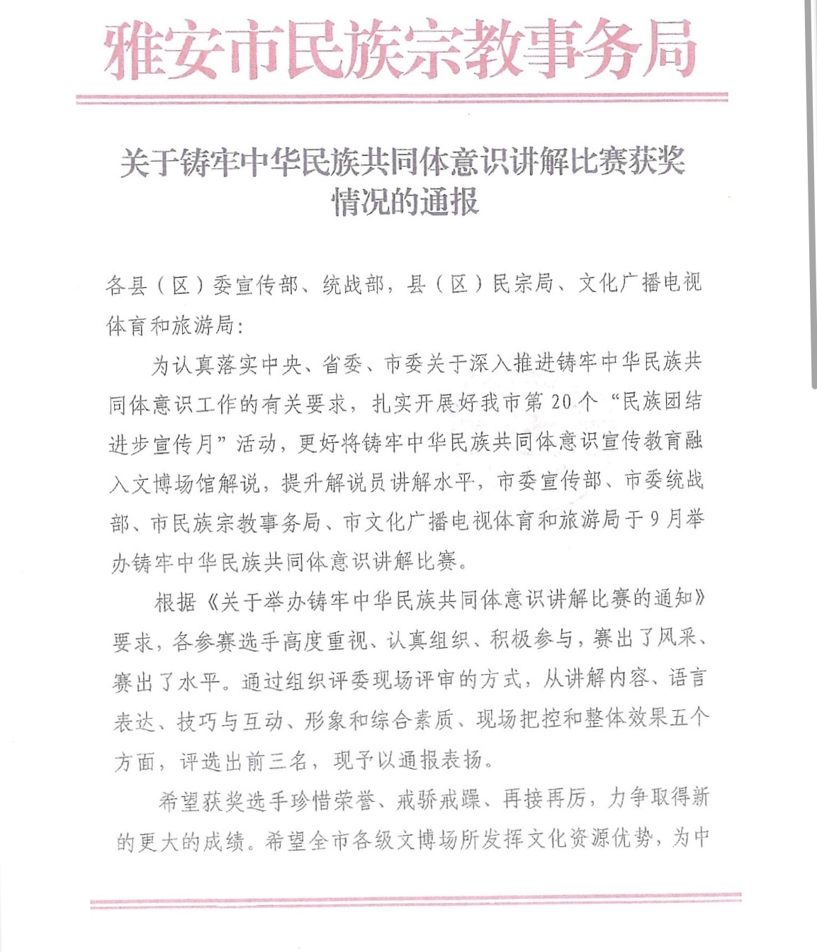 为深入贯彻落实中央、省委、市委关于铸牢中华民族共同体意识工作的决策部署,扎实推进我市第20个“民族团结进步宣传月”活动走深走实,更好将铸牢中华民族共同体意识宣传教育融入文博场馆解说,提升讲解员讲解水平,市委宣传部、市委统战部、市民族宗教事务所、市文化广播电视体育和旅游局于9月成功举办了“铸牢中华民族共同体意识”主题讲解比赛。